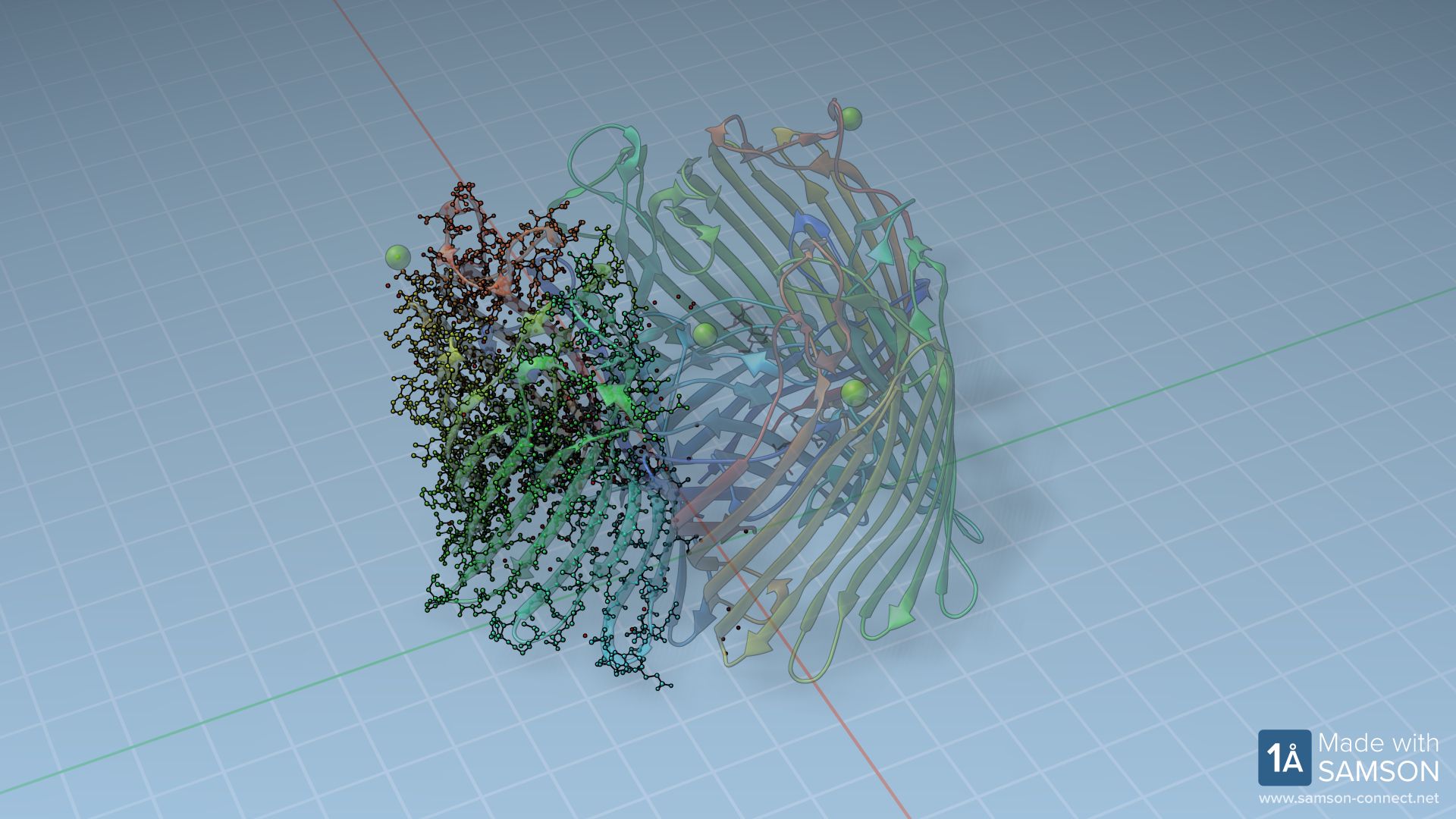 Several entrance and exit animations are used to progressively convert the ball-and-stick structure into other visual representations.