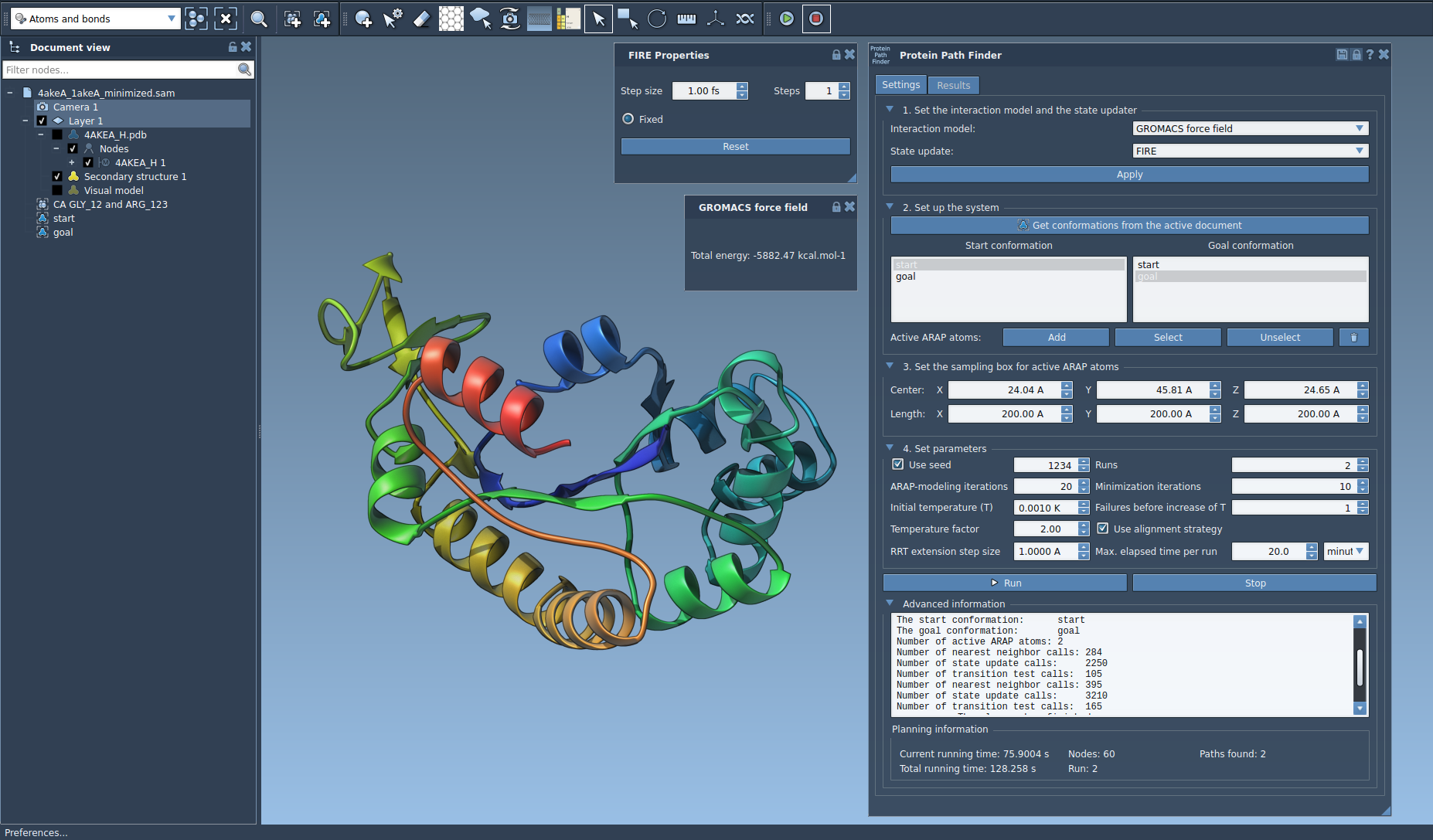 Easily define the system and specify the search domain. Find protein conformational transition paths between two conformations in a matter of minutes thanks to the novel ART-RRT method.