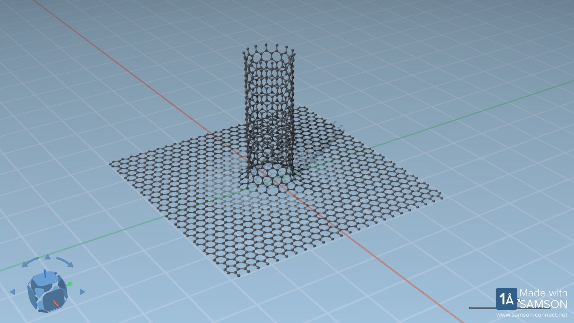 A nanopore model built by assembling a graphene sheet and a nanotube, removing some atoms and using the Brenner reactive force field during interactive minimization.