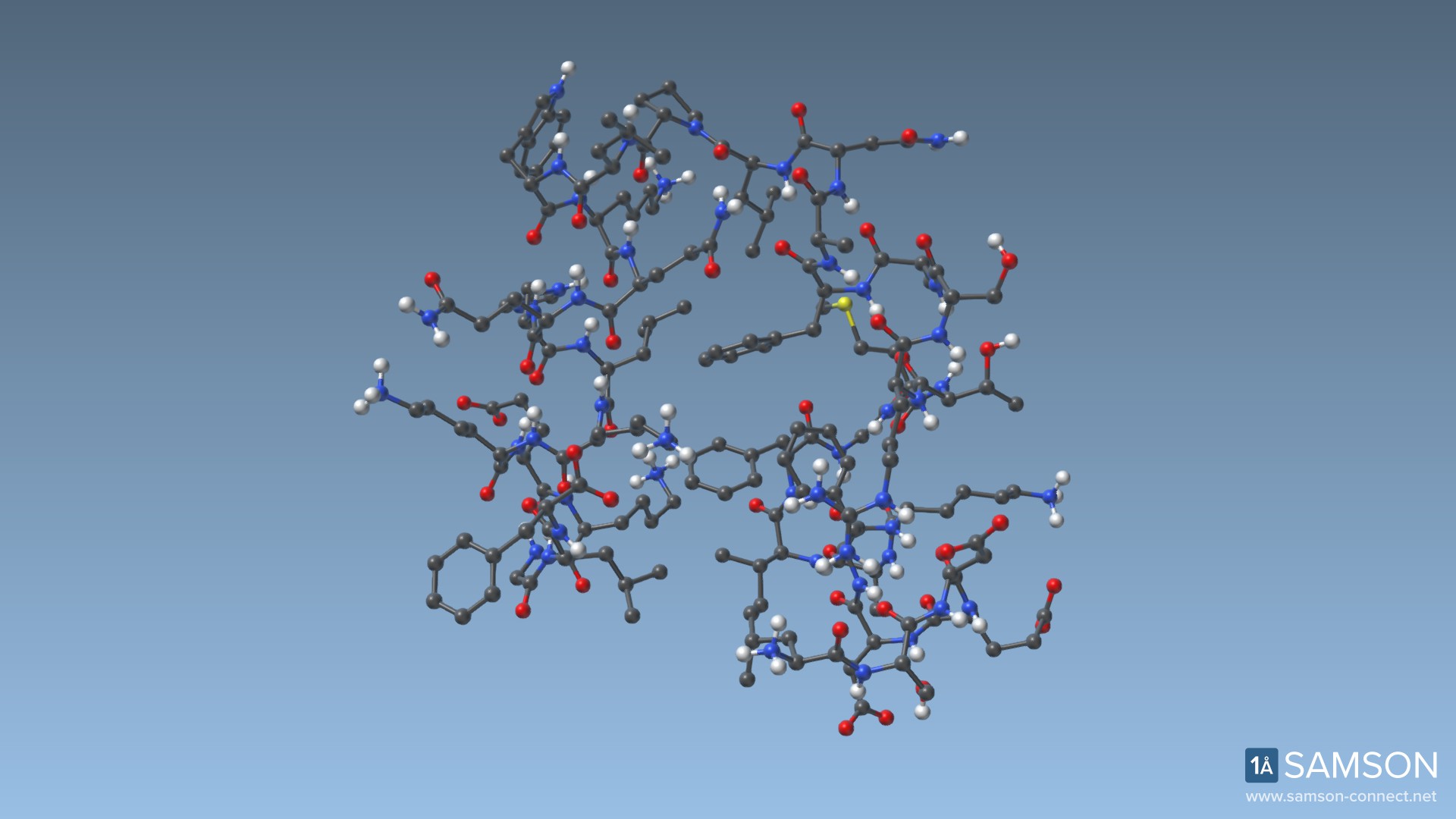 This is the villin headpiece (adapted from a model from the Protein Data Bank, with PDB Code 1YRF).
