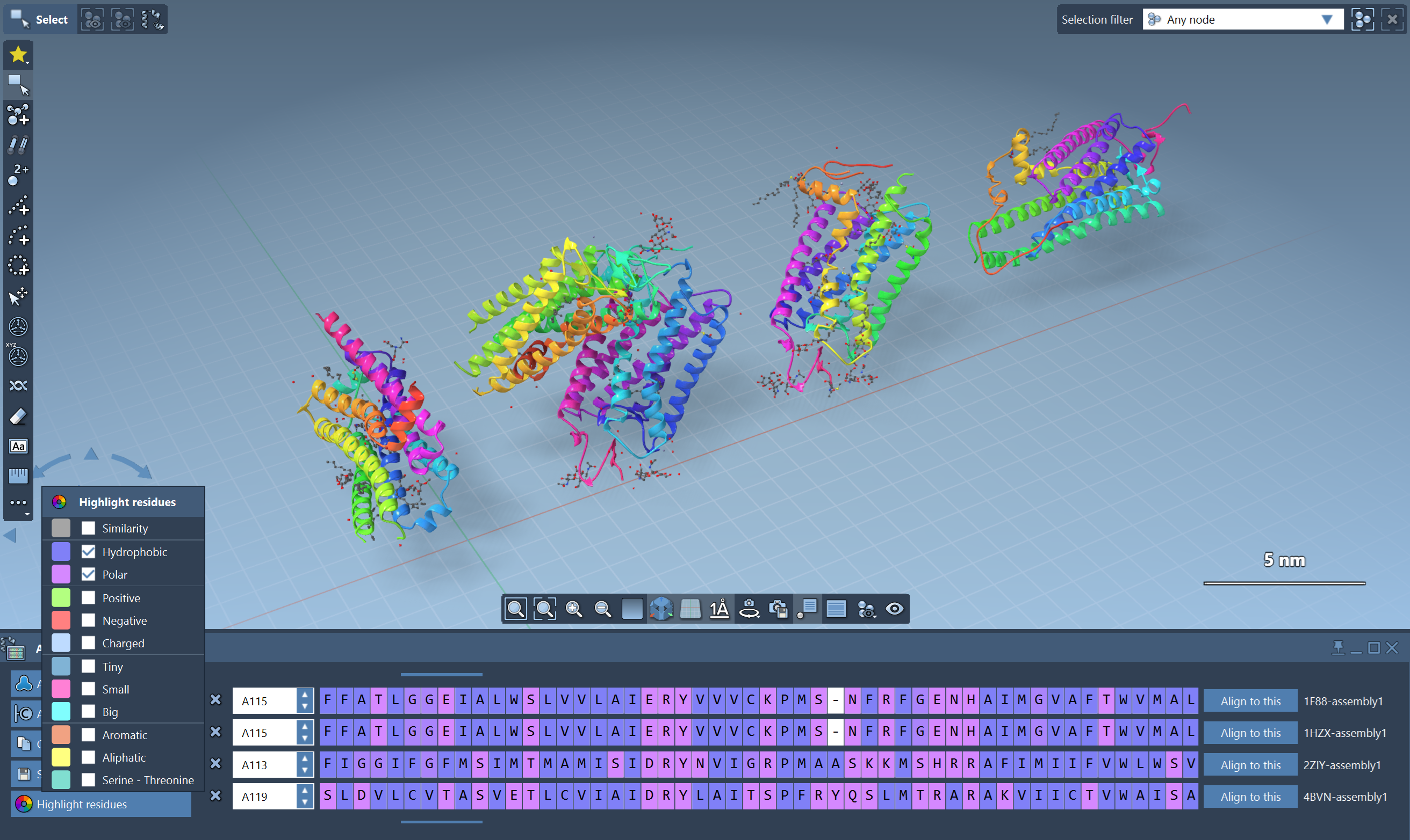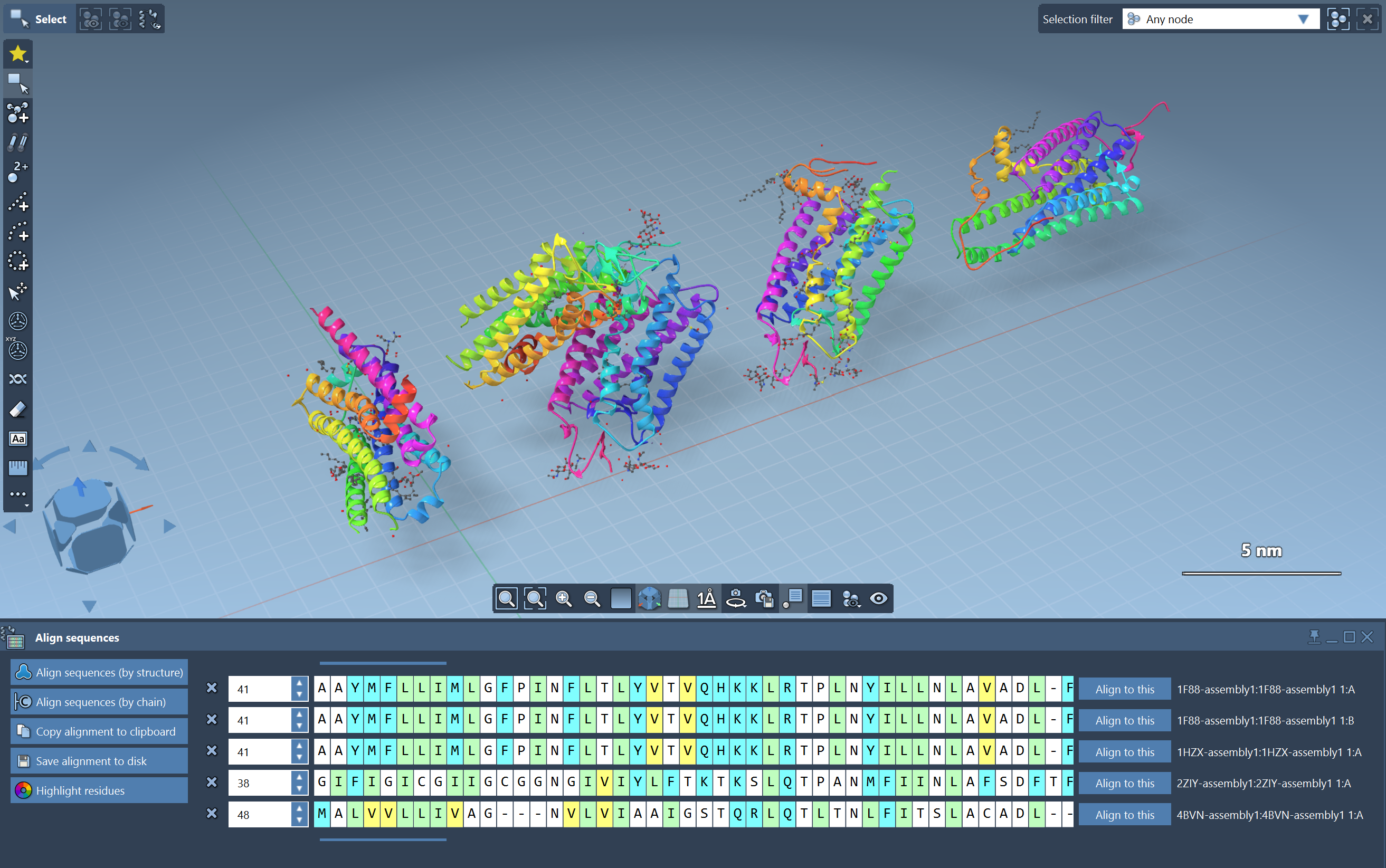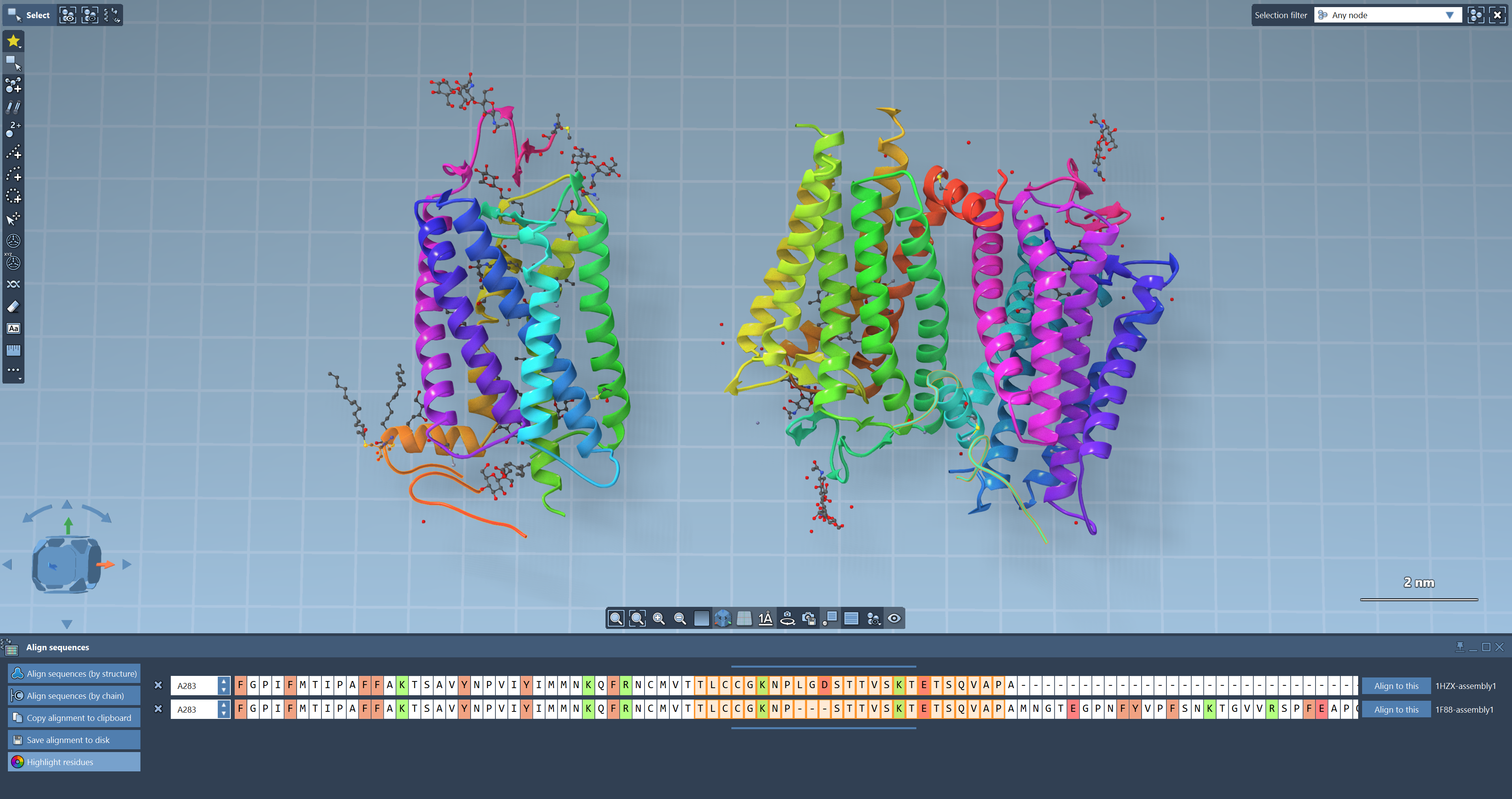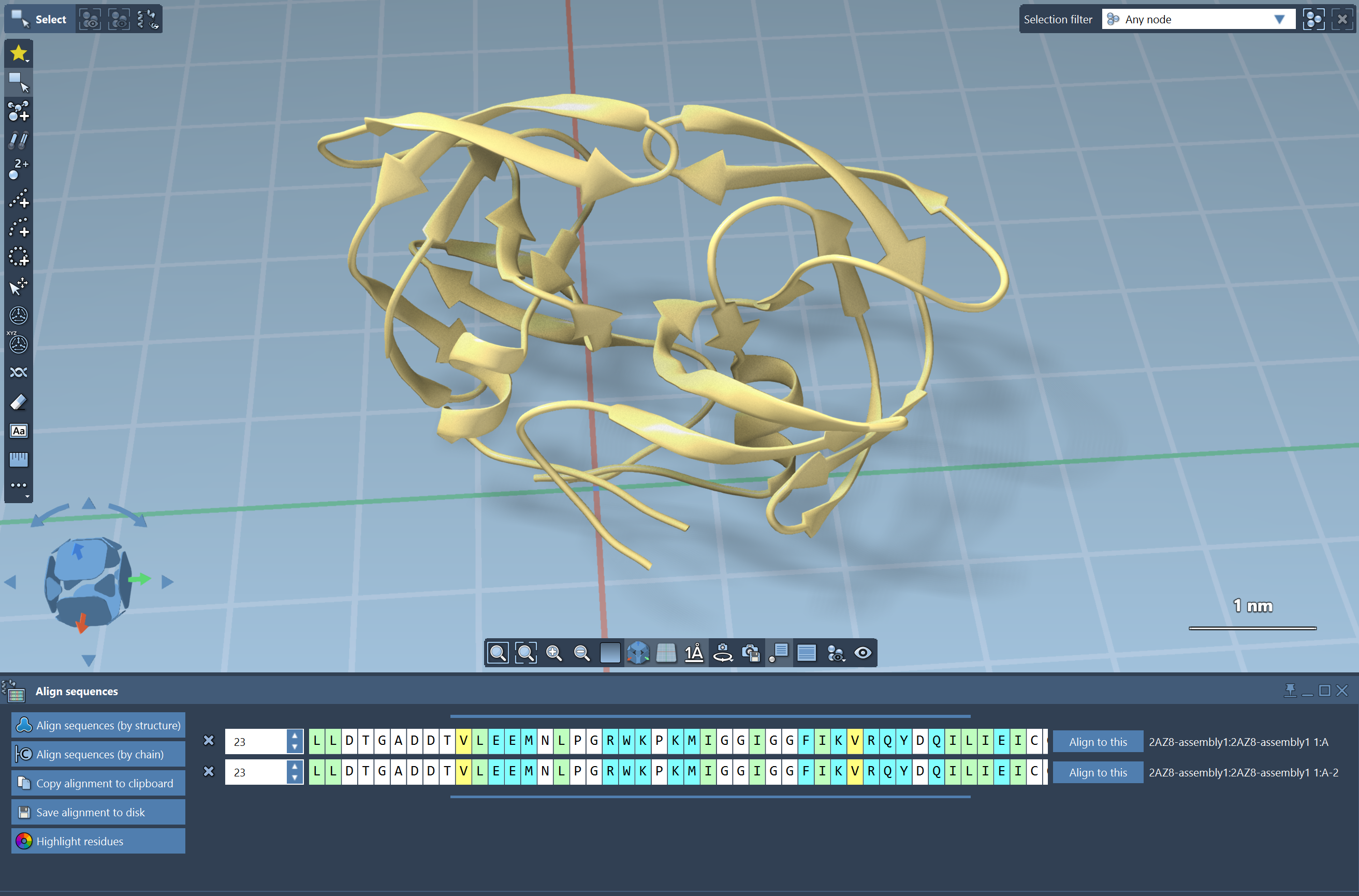 Important: structural alignment is performed based on the currently selected residues. Select a subset of residues to align structures based on these residues only (fe.g., where chains or structures have high local similarity).