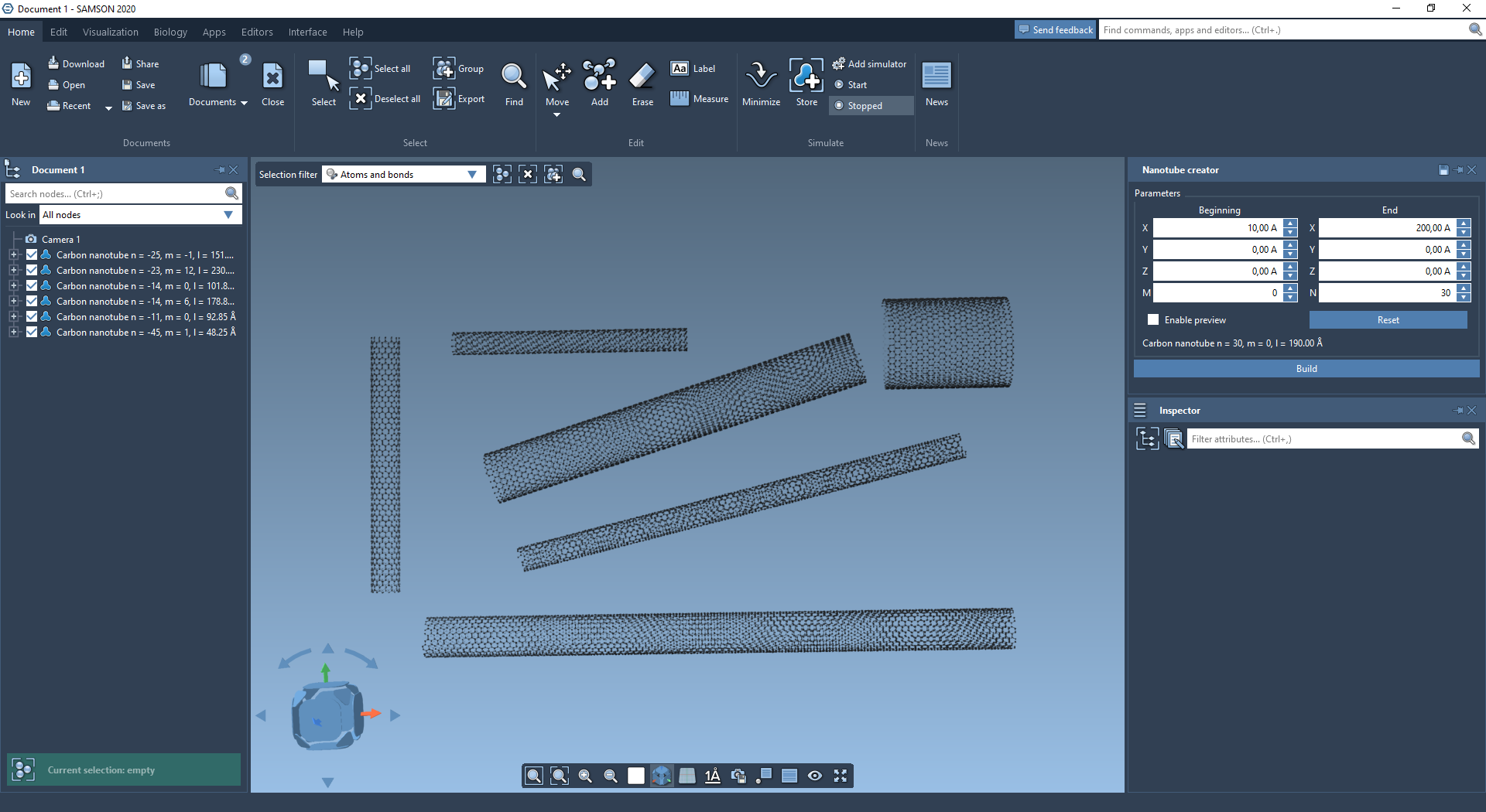 You may then use the Brenner Interaction model to interactively simulate generated nanotubes.