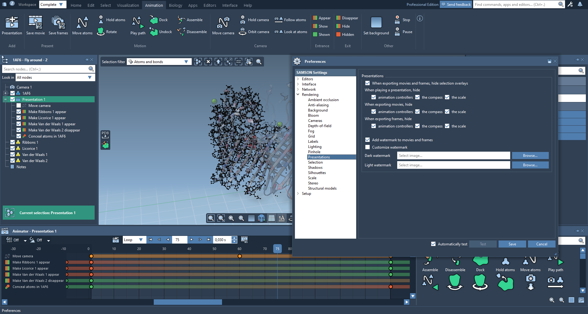 You can specify whether to add a watermark and provide your own watermarks. You can also specify whether to show or hide the selection overlays, animation controllers, the compass, and the scale.