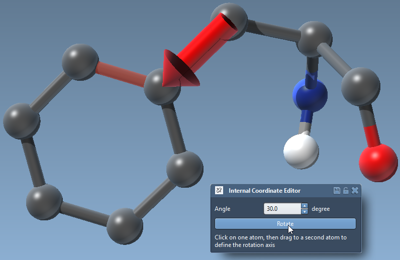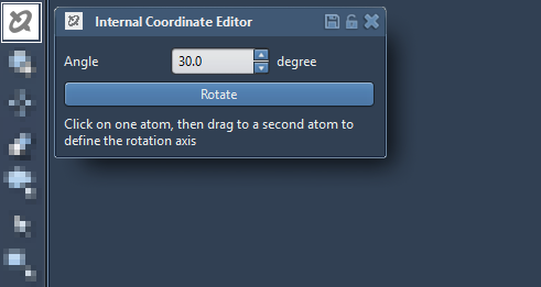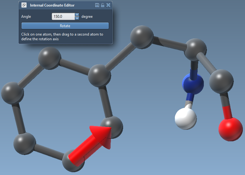 This editor rotate the molecule by defining rotation axis and rotation angle. The user define the rotation axis (represented by an arrow in the view) by clicking on one atom and drag it to the second atom. The rotation angle is defined by the small GUI windows. The editor will try to rotate all the atoms after the head of the arrow and in between the tail and head of the arrow