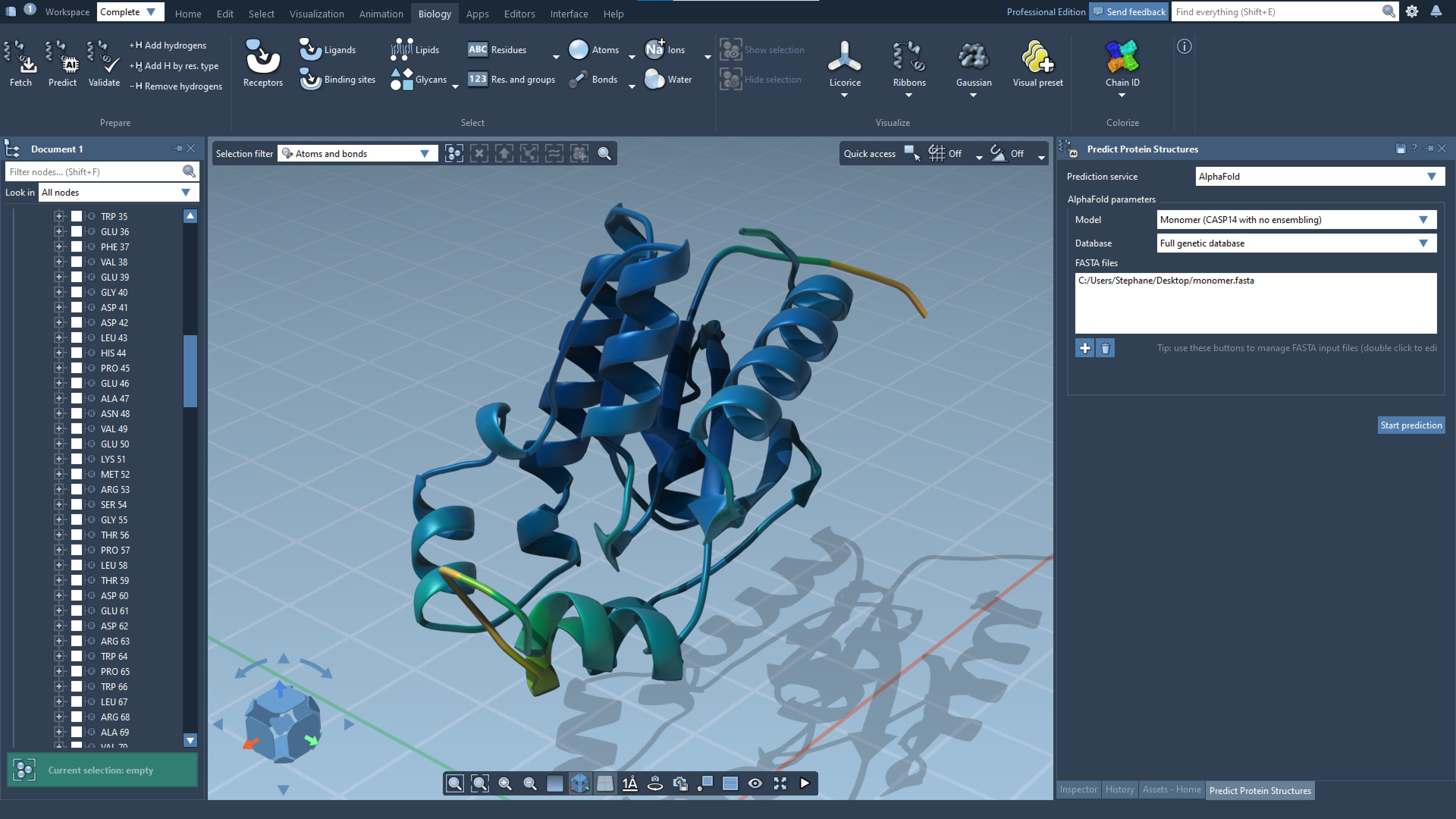 Enter one or more FASTA files, choose the AlphaFold model (monomer, multimer, etc.) and the database for multiple sequence alignment, and click 'Start prediction'.