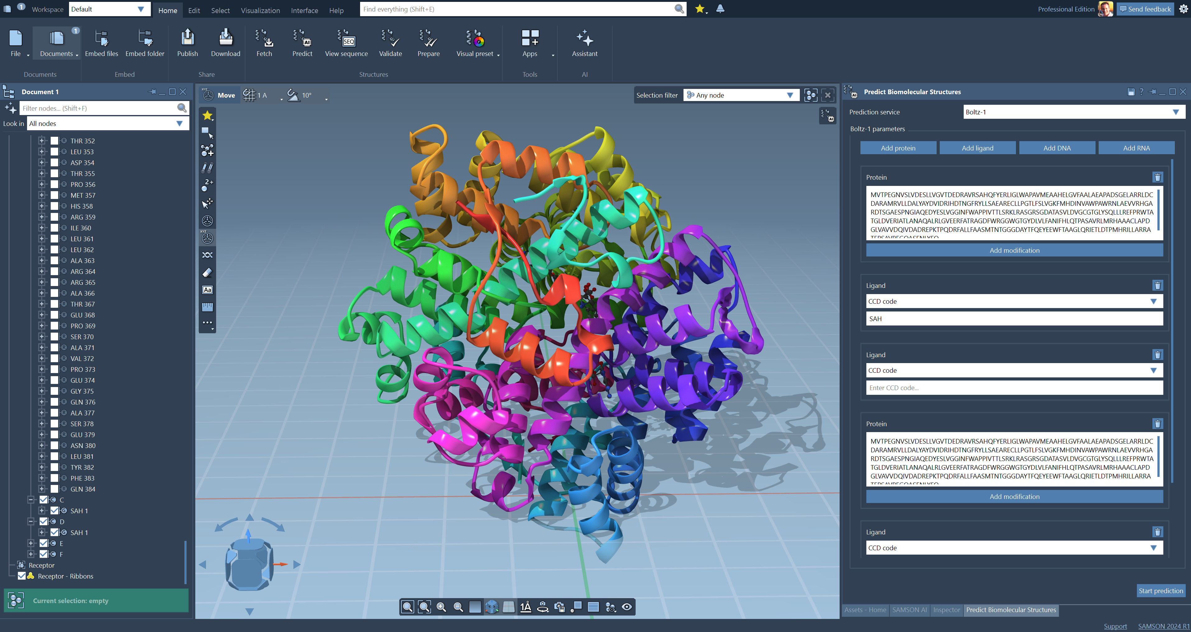 Click on 'Add protein', 'Add DNA', 'Add RNA' or 'Add ligand' to enter the corresponding sequences, CCD codes or ligand SMILES strings.