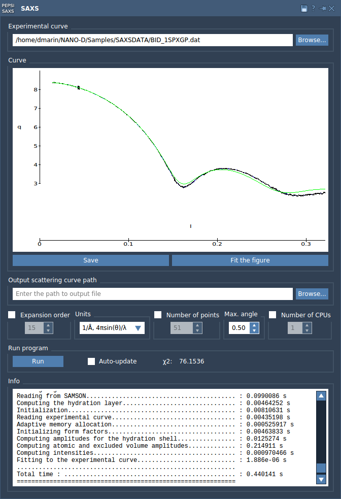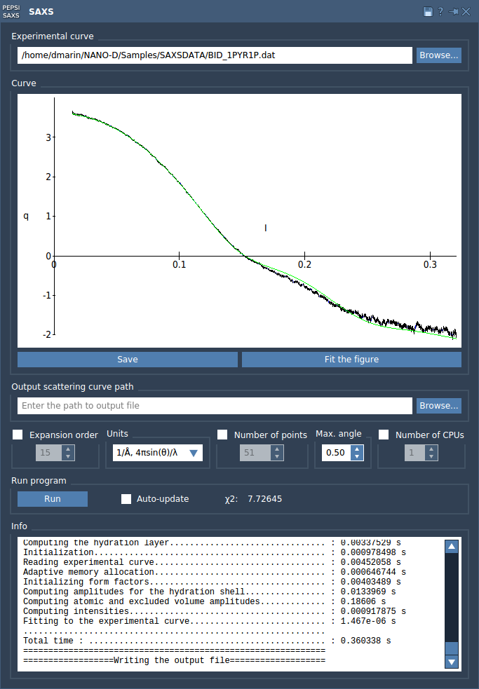 Pepsi-SAXS is based on the spherical harmonics expansion method and interactively updates the fits if the molecular structure is modified. Multi-threading is currently only supported for Linux & macOS.
