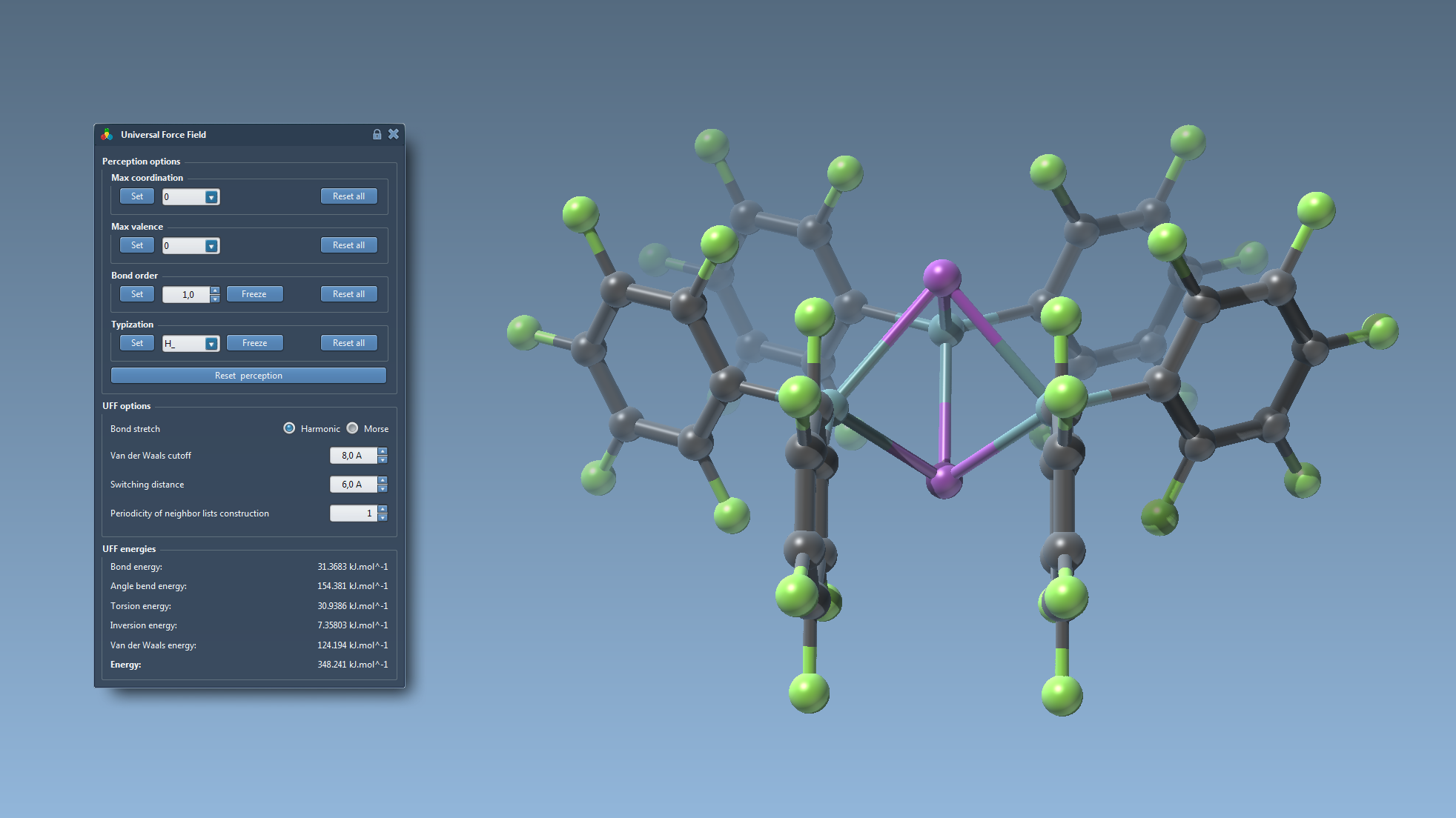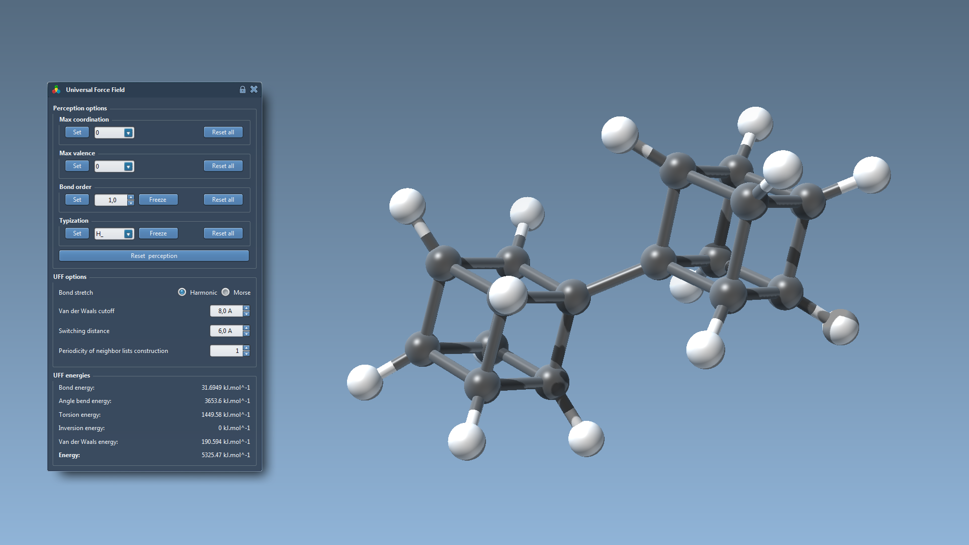 To use UFF in an interactive simulation, add a simulator to the document from the Home menu, and choose "Universal Force Field". The property window of the interaction model makes it possible to customize the perception and set up the interaction model (e.g. choose the cutoff), and displays the various energy types and the total energy.