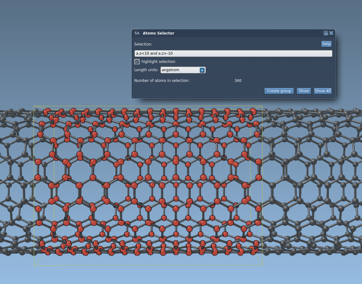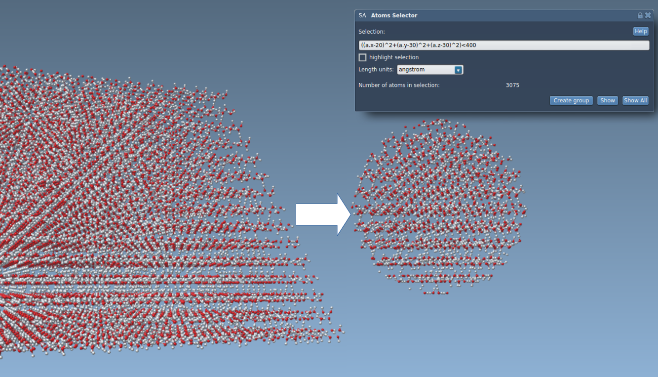 This extension allows selecting atoms based on expressions with the usage of NSL-like variables (NSL - Node Specification Language), standard mathematical and logical operations.