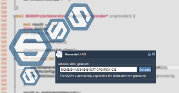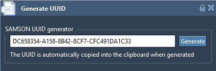 This extension can be used to generate UUIDs directly from SAMSON in one click. Once you click on the Generate button, the UUID is automatically copied into the clipboard.