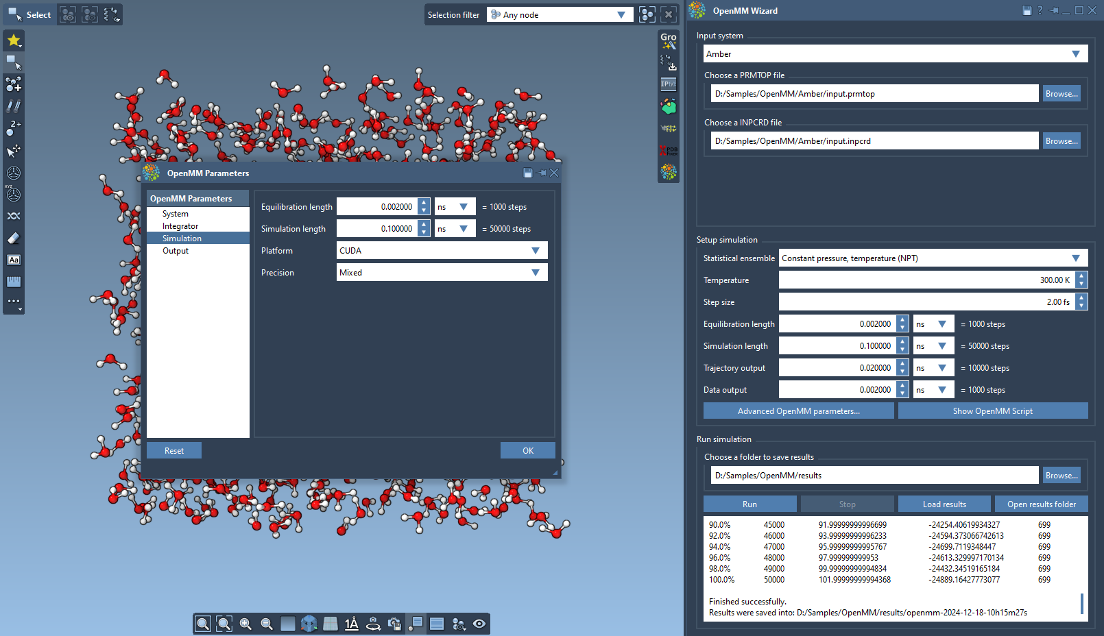 It will automatically install the required OpenMM Python packages in your SAMSON, including packages to run on Nvidia GPUs using CUDA and AMD GPUs using HIP6. You can choose the platform in the advanced parameters.