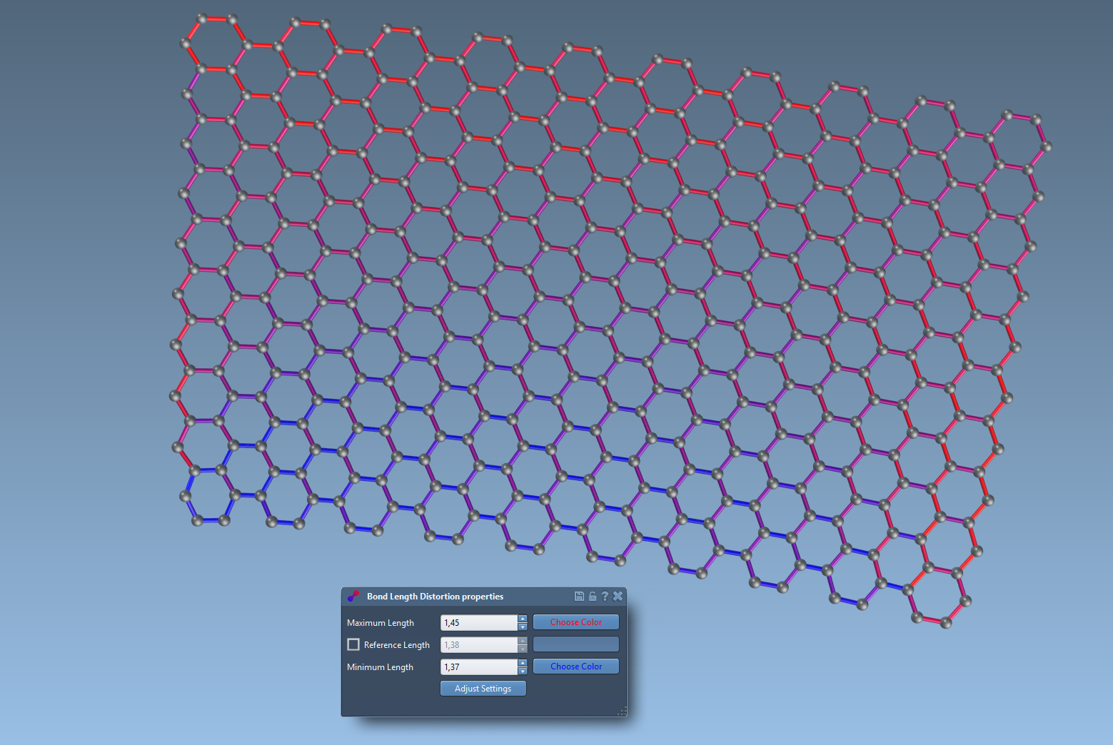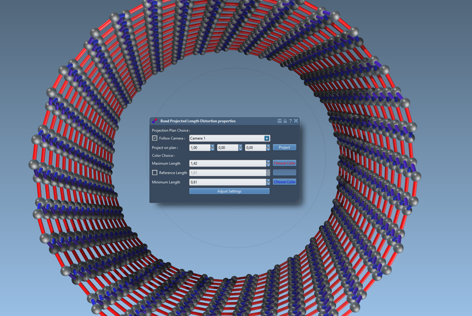 This App permits to visualize with colors the distortion of a molecular or crystalic structure. The angle distortion, the bond distortion and the projected bond distortion can be represented with colors on bonds and atoms.