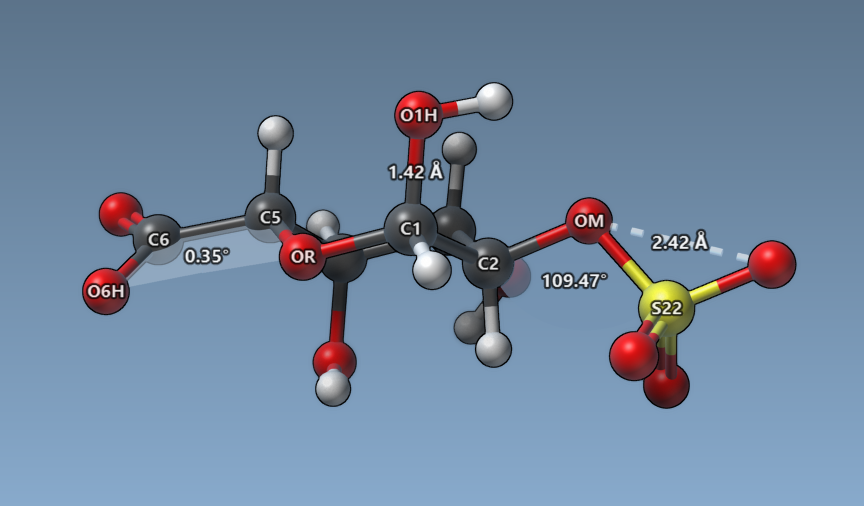 Click on three atoms to display the angle between the atoms.