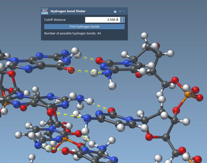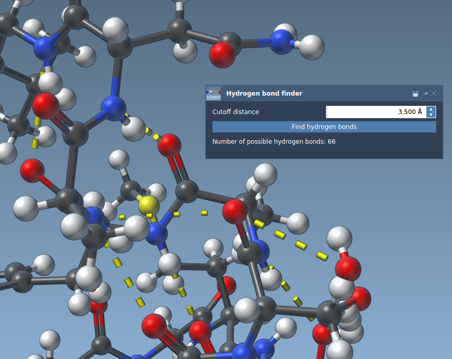 The bonds are detected based on a max. threshold distance and angle between donor, hydrogen and acceptor atoms, and displayed as a visual model.