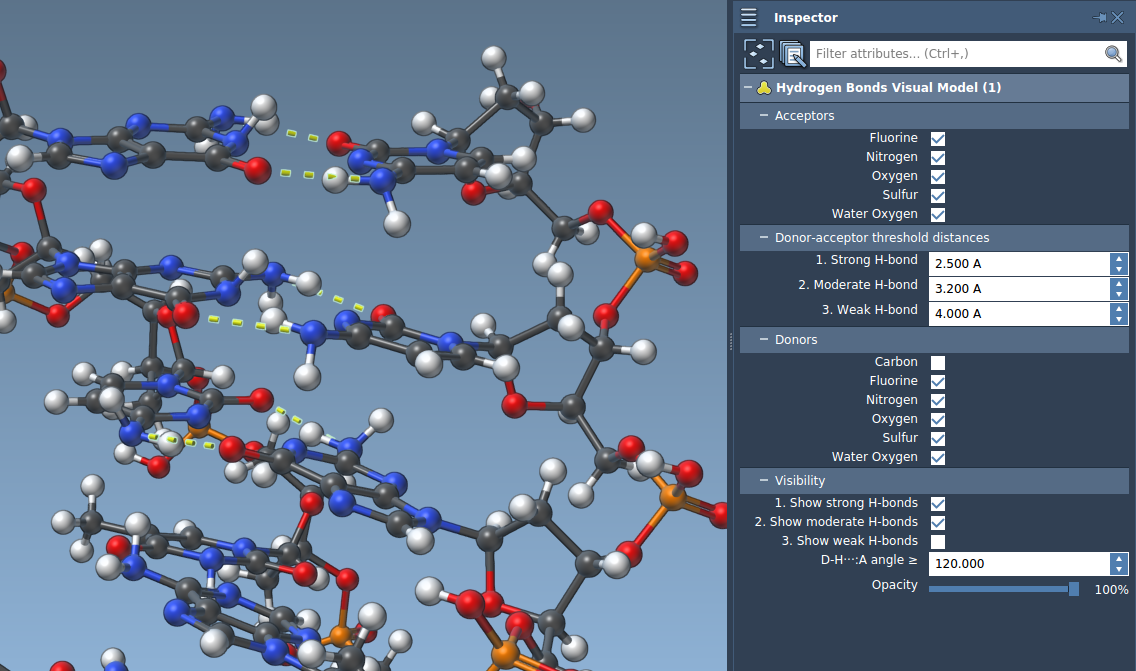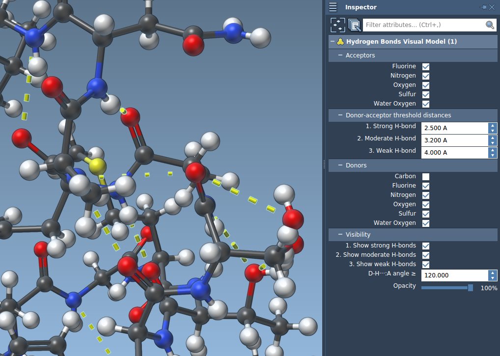 You can modify parameters of the displayed H-bonds in the Inspector for the visual model.
