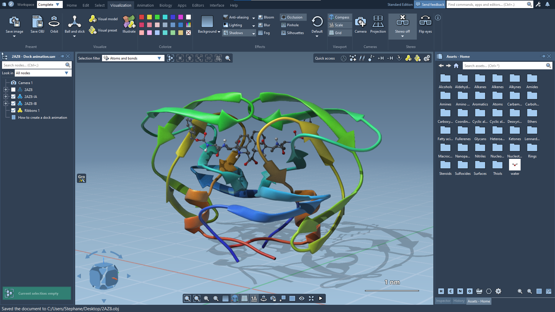 To export to the OBJ format, select what you want to export and, in the Visualization menu, click on the Save OBJ command. Depending on the selection (atoms, surfaces, etc.), multiple saving options will be offered.