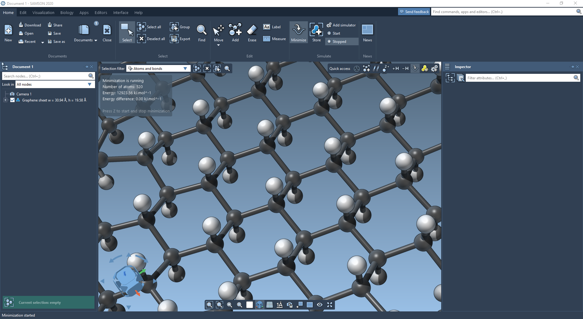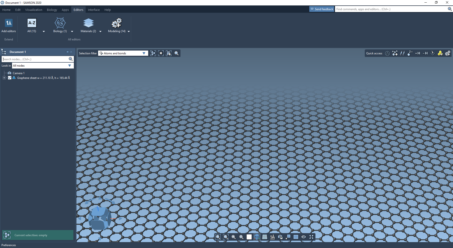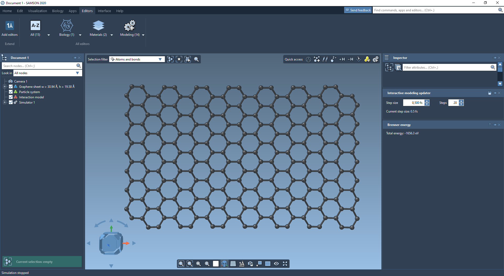 Interactive hydrocarbon modeling (e.g., using the Brenner interaction model) may then be used to add bonds, simulate and edit the graphene sheet, etc.
